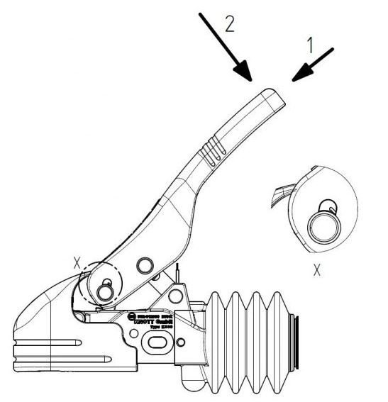 M12/M12, M12/M14 et M14/M14 . Tous les accessoires de montage sont inclus ! – Design attrayant – Installation possible après-vente sans homologation TÜV – Système d’amortissement sur l’attelage – Homologué pour la limitation de vitesse à 100 km/h selon la norme ISO 11555-1 – Pour des charges de remorque jusqu’à 3 000 kg – Possibilité d’ajouter un verrou (intégré à l’attelage). Remarque : La force nécessaire pour activer le stabilisateur peut être considérablement réduite en appliquant d’abord une force dans la direction 1, puis la force de serrage effective dans la direction 2.