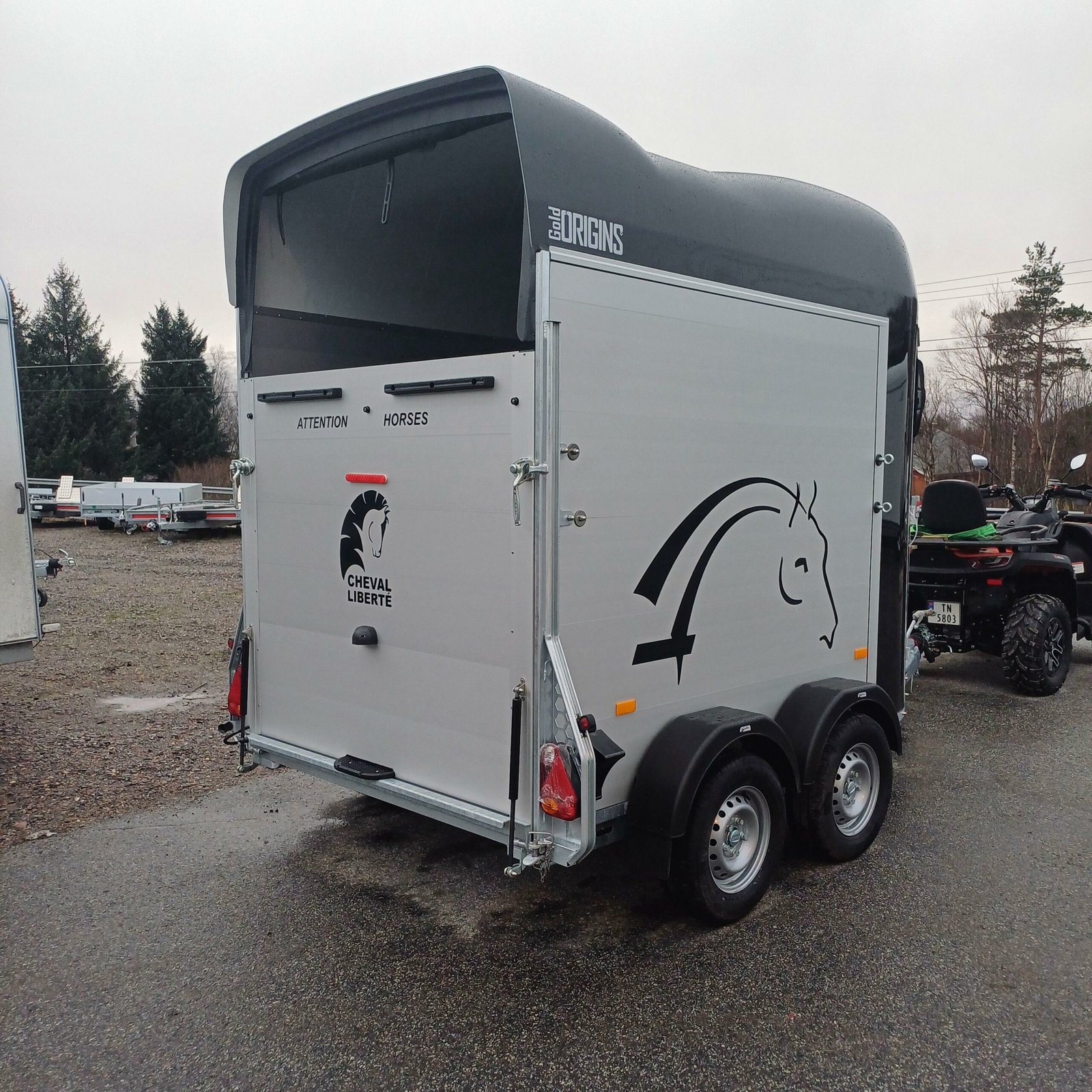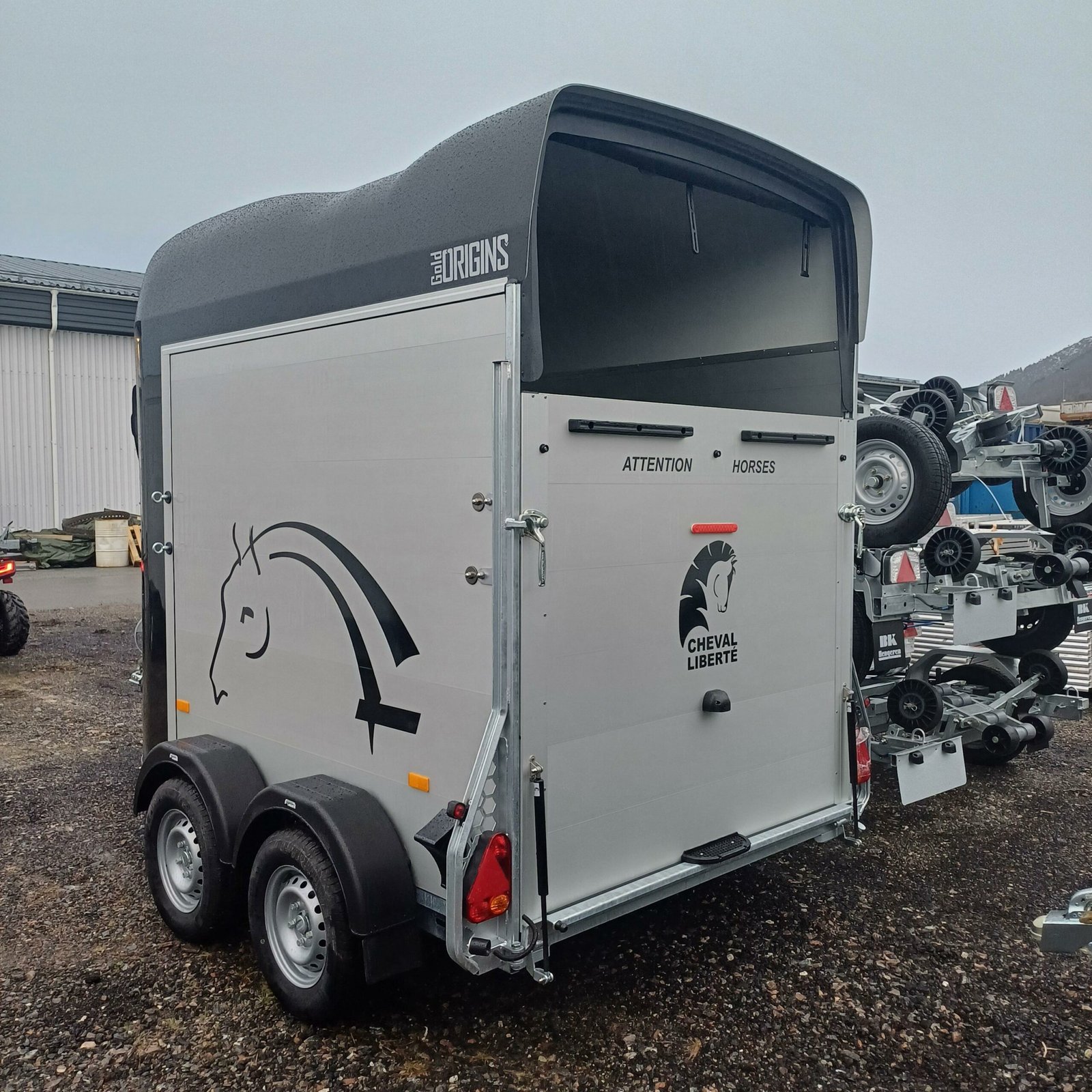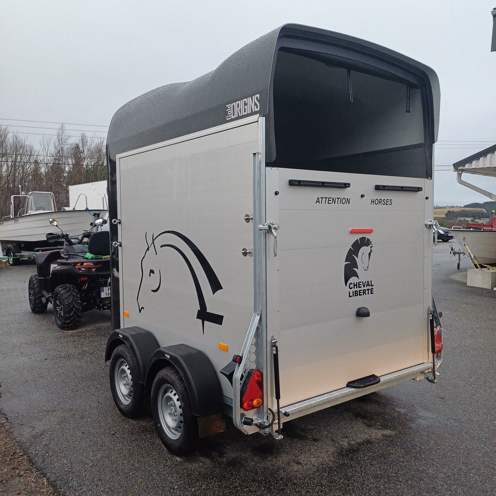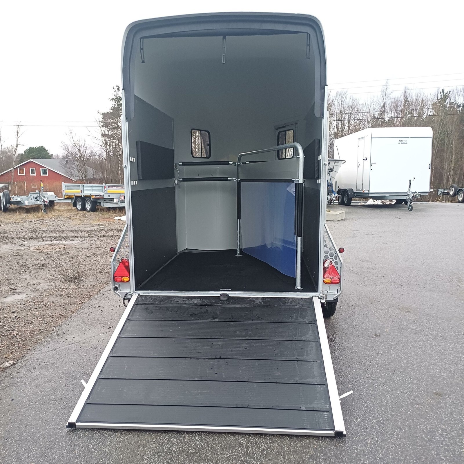 antidérapante en PVC avec cadre en acier Toit et support avant pour poney en polyester Châssis abaissé Rembourrage latéral Plaques de protection Grande fenêtre coulissante des deux côtés avant Suspension à torsion Parois en aluminium SUPPLÉMENTAIRES ÉQUIPEMENT 2 feux de recul supplémentaires 4 feux de recul supplémentaires Jantes en alliage noir ou argent Tapis de sol en caoutchouc supplémentaires Hayon complet Cloison Stallion Pack caméra – Caméra intérieure et/ou caméra de recul Masse d’attelage tribord 150 Coffre de rangement grand format Pneus toutes saisons M+S Immatriculation du poids total autorisé en charge Roue de secours 185/70R13 avec support et housse Roue de secours sur jante en alliage Roue de secours : Housse pour roue de secours Store enrouleur étanche en PVC, largeur : 167 cm Chambre à selle Vitrine MIDI – Bâche, grise, bleue ou verte Vitrine MIDI avec roues pneumatiques – Gris standard Amortisseurs Support de sulky Télescopique 4 sections en acier inoxydable Housse pour timon Porte-cartes de remorque, entièrement assemblé