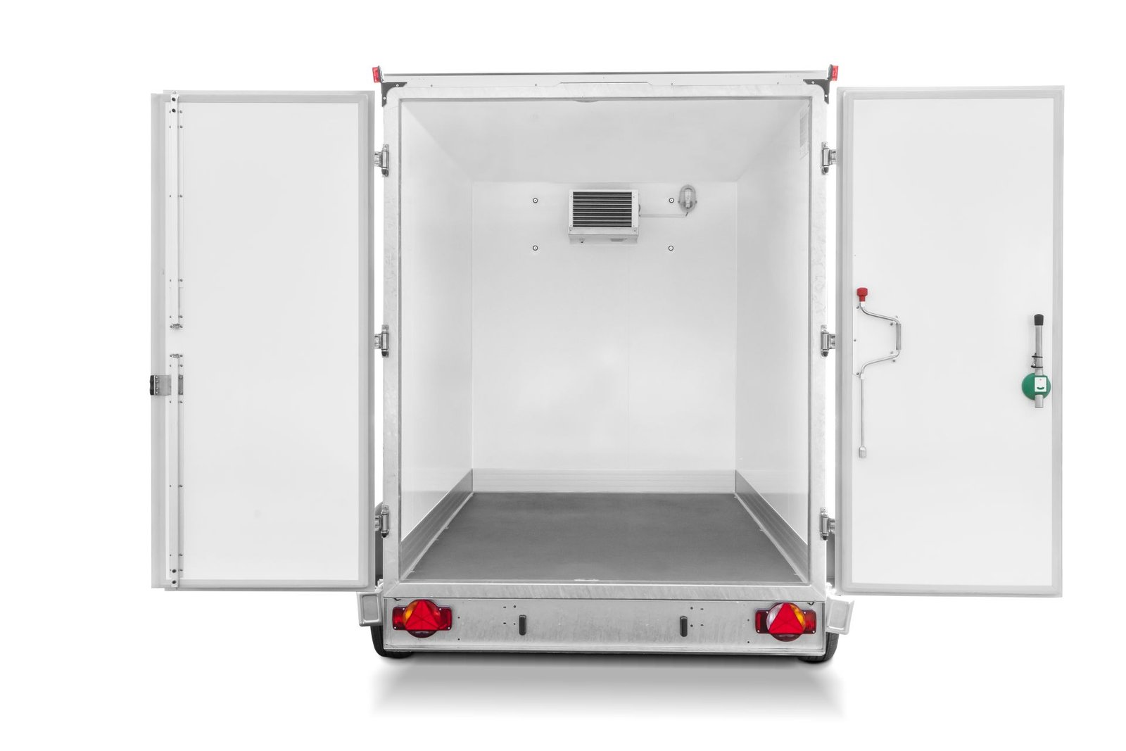 Transportez vos marchandises à des températures négatives grâce à notre remorque frigorifique. Son groupe frigorifique offre une plage de température réglable de +10 °C à -20 °C. Pour garantir le maintien d’une température basse et constante à l’intérieur du compartiment réfrigéré, la remorque est dotée d’une isolation performante. Le plancher, d’une épaisseur de 80 mm, est composé d’une âme en mousse rigide. Les parois, de même épaisseur, sont revêtues de tôle d’acier et doublées intérieurement de PVC. Cette conception rend la remorque particulièrement adaptée au transport de denrées alimentaires, dans le strict respect des normes d’hygiène alimentaire. Sur ce modèle, les ferrures et les charnières sont en acier inoxydable.